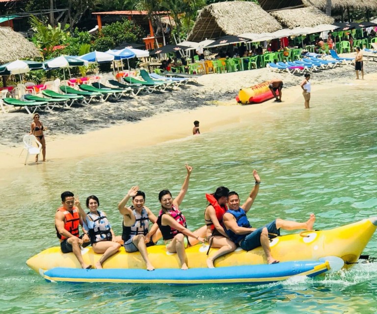 We woke up a little on the hungover side after a night out, (watch video above again) but managed to start our day by exploring Playa Animas. We rented a small boat through our Airbnb, which came out to be cheaper than doing an excursion through an outside tour agency. It was $60 per hour and there were a total of 7 people in our group. The boat took us through the famous Isla Roca Los Arcos and offered us snorkel equipment. (Although, we opted out of the snorkel due to all the jellyfish in the water). Once we got to Playa Animas, we rented a banana ride for 160 pesos for 10 minutes. That’s equivalent to $8-$9. If you aren’t familiar with the banana boat, here’s a picture below.